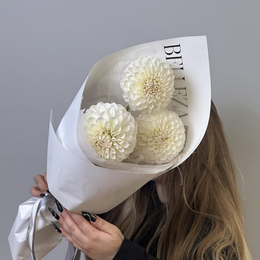 На фото букет из 3 белых георгин. В составе: георгина 3 шт, сухоцветы (микс) 2 шт, дизайнерская упаковка 1 шт, атласная лента 1 шт, . Все цветы свежие и ароматные, букет красиво оформлен и отлично подходит для подарка. Доступна доставка цветов или самовывоз.