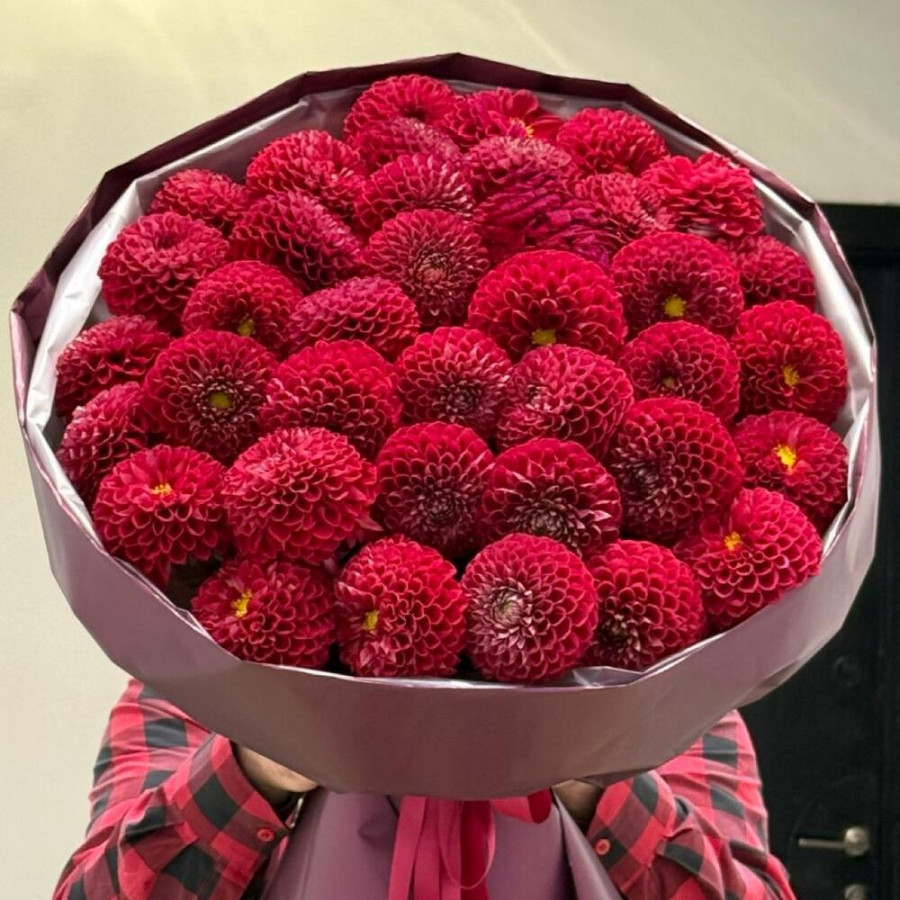 На фото букет из 39 красных георгин. В составе: георгина 39 шт, дизайнерская упаковка 2 шт, атласная лента 1 шт, . Все цветы свежие и ароматные, букет красиво оформлен и отлично подходит для подарка. Доступна доставка цветов или самовывоз.