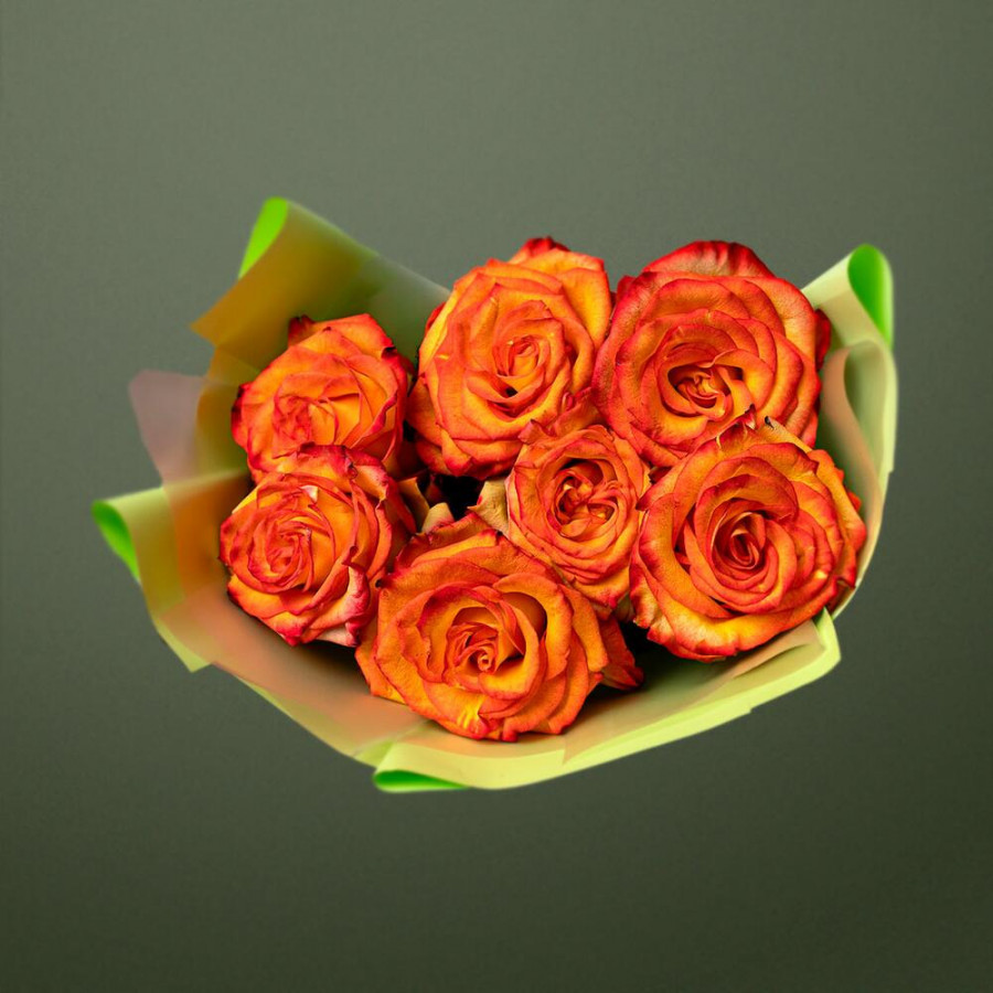 На фото букет из 7 оранжевых роз. В составе: роза 7 шт, дизайнерская упаковка 2 шт, атласная лента 1 шт, . Все цветы свежие и ароматные, букет красиво оформлен и отлично подходит для подарка. Доступна доставка цветов или самовывоз.