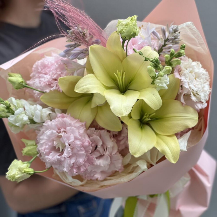 На фото букет «хрустальный луг». В составе: лилия 3 шт, эустома (лизиантус) 4 шт, зелень 3 шт, дизайнерская упаковка 1 шт, атласная лента 1 шт, . Все цветы свежие и ароматные, букет красиво оформлен и отлично подходит для подарка. Доступна доставка цветов или самовывоз.