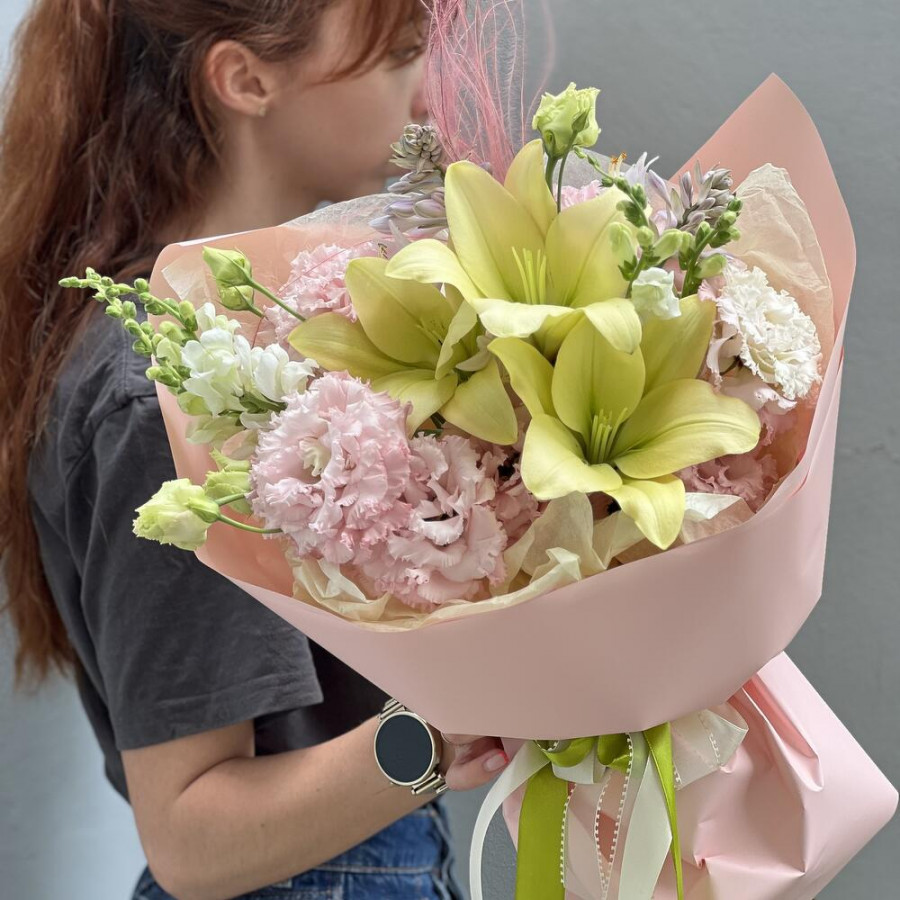 Перед выездом курьера пришлём фото свежесобранного букета, чтобы вы были спокойны